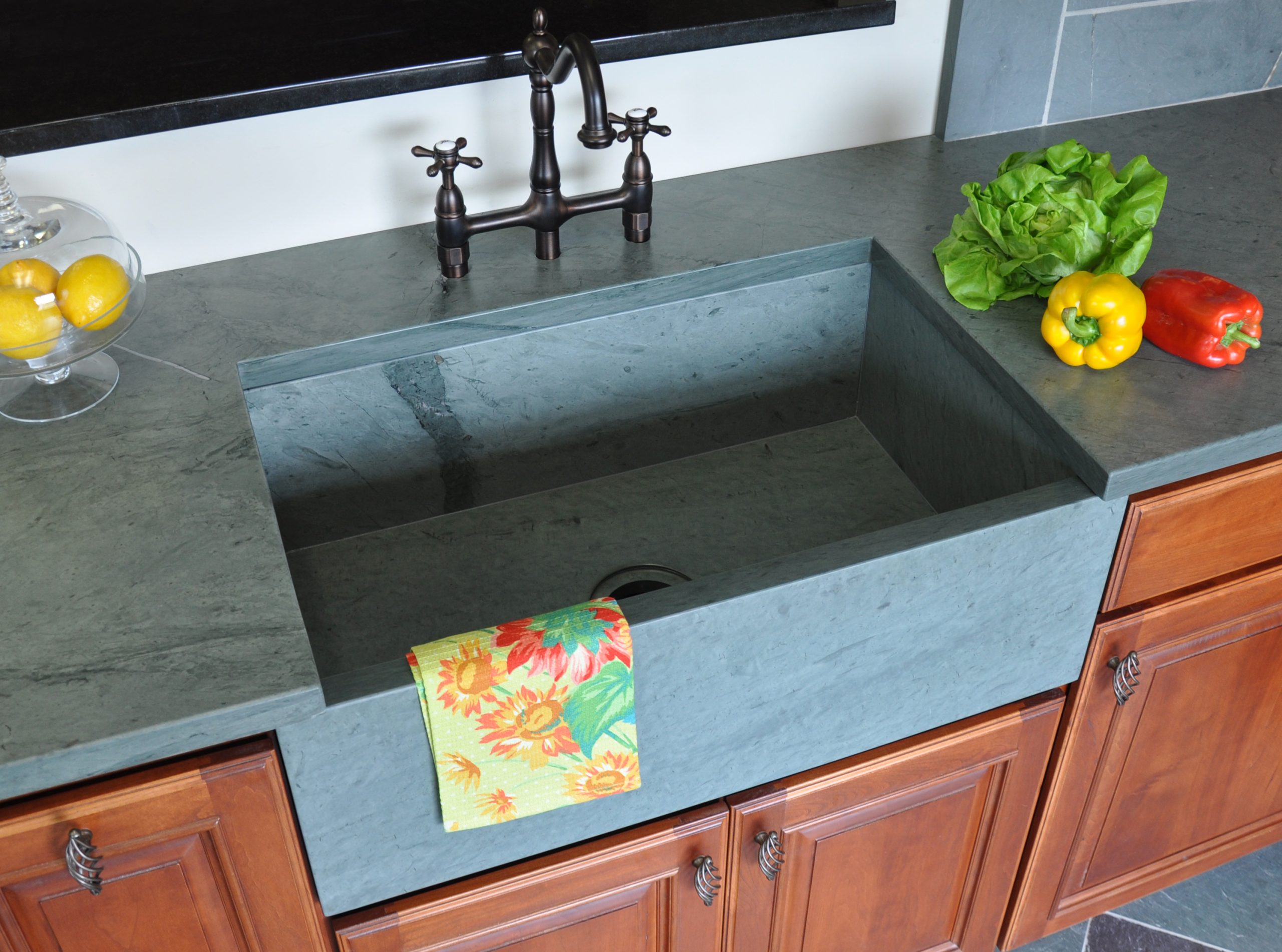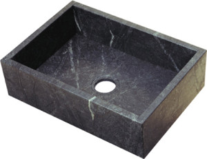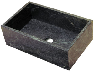 RMG Stone offers 3 standard-sized Green Mountain Soapstone™ sinks. These traditional, fabricated sinks are tongue-and-grooved with sloped bottoms for optimal drainage. Holes are sized for a standard kitchen drain basket, and all sinks are bench tested before shipment and shipped untreated. We can also make any custom-sized fabricated sink – just email the outside dimensions to mary@rmgstone.com.